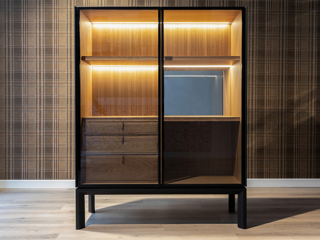 Las puertas de cristal ligeramente tintadas, aligeran la pieza y permiten ver el contenido de los estantes. Estas pueden ir en línea con los costados o enmarcadas con la propia estructura del mueble.