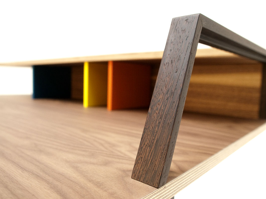 La superficie de trabajo, fabricada en contrachapado de abedul acabado en nogal, introduce una paleta cromática con vivos contrastes en elementos verticales lacados en azul, rojo con tintes anaranjados y amarillo intenso. Como alternativa, se ofrece la opción del maple, roble fumé, roble acabado wengué y roble natural en combinación con varios colores en laca.